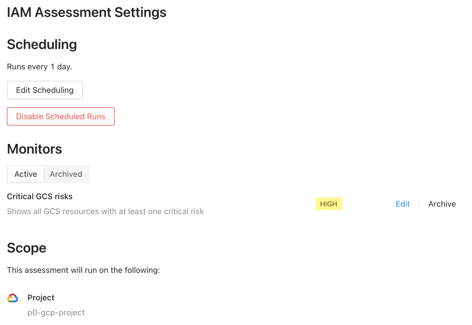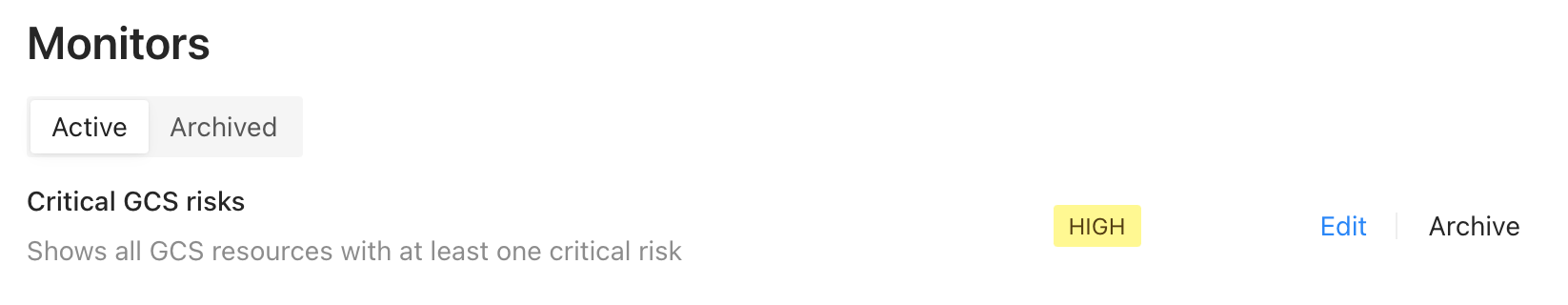 Edit monitors to change their severity, description, or search query. Archive monitors to prevent them from running on future assessment jobs. Archived monitors will also be removed from your default findings view.