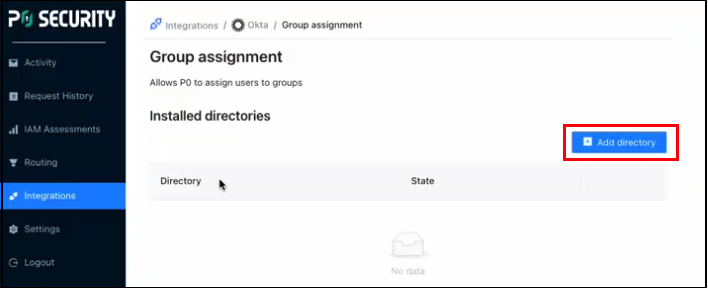 <figure><img src="https://3783273641-files.gitbook.io/~/files/v0/b/gitbook-x-prod.appspot.com/o/spaces%2FSQNwGQz62W737pY0FzVb%2Fuploads%2Fgit-blob-5db50a4eb5012b9fc0bb850415a1a897e93fd300%2FPicture1.png?alt=media" alt="P0 Okta Directory listing page with Add directory button highlighted" width="375"><figcaption></figcaption></figure>