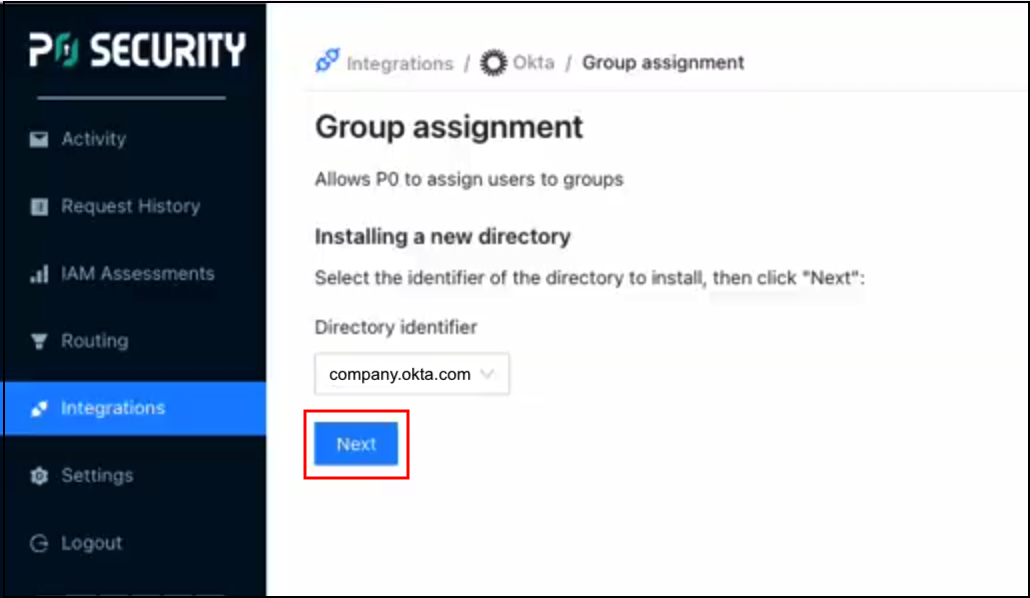 4. Select the [directory identifier](#integrate-okta-for-p0) from the dropdown and click **Next**.