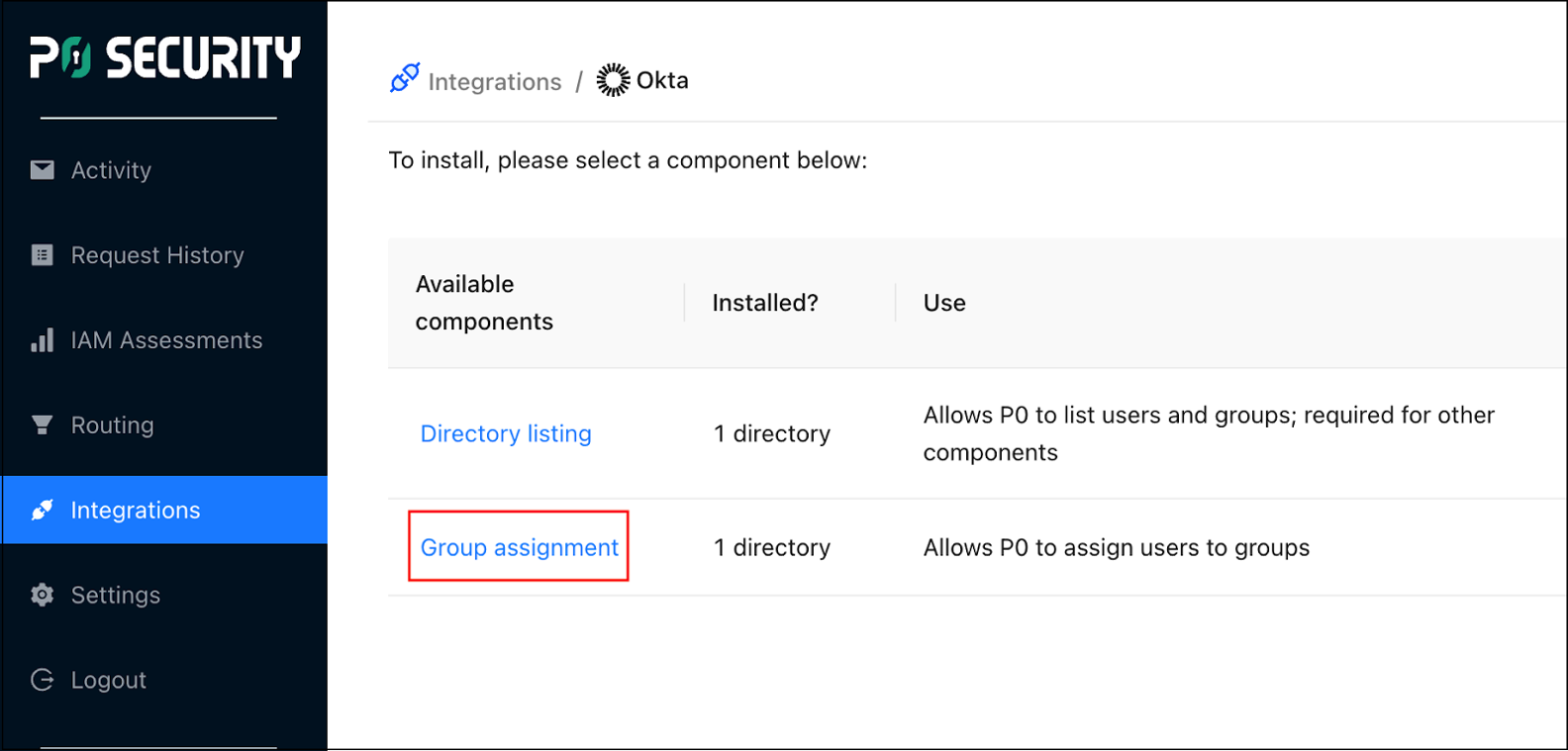 <figure><img src="https://3783273641-files.gitbook.io/~/files/v0/b/gitbook-x-prod.appspot.com/o/spaces%2FSQNwGQz62W737pY0FzVb%2Fuploads%2Fgit-blob-dc03b70a4ccc52c0dd3729caf1909e9c9d26f6d6%2Fimage.png?alt=media" alt="P0 Integrations page with Okta highlighted in the Directories section" width="375"><figcaption></figcaption></figure>