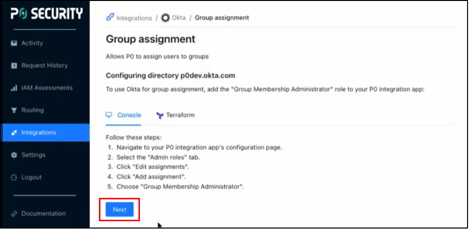 11. Return to the browser tab for the [P0.app](https://p0.app/) **Group assignment** page and click **Next**.