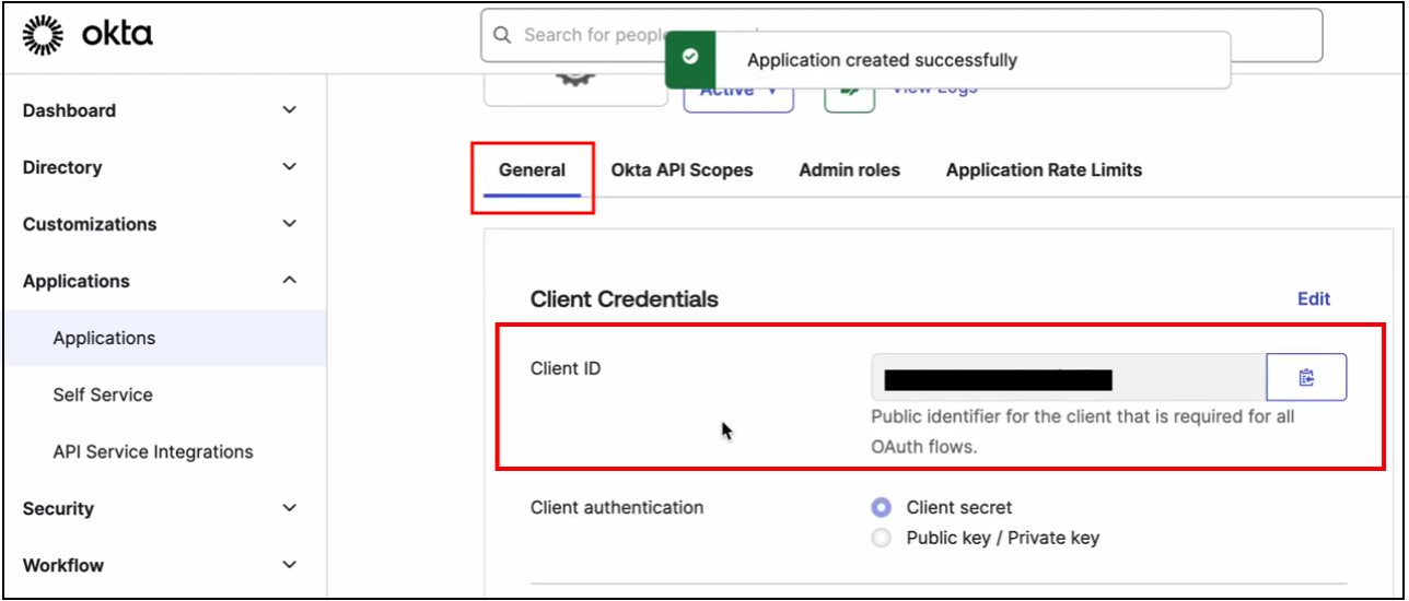 <figure><img src="https://3783273641-files.gitbook.io/~/files/v0/b/gitbook-x-prod.appspot.com/o/spaces%2FSQNwGQz62W737pY0FzVb%2Fuploads%2Fgit-blob-09dc7e56cf61fd3132b1c338c7de2b23f05577a1%2Fimage.png?alt=media" alt="Okta application General tab showing Client Credentials section with Client ID" width="563"><figcaption></figcaption></figure>