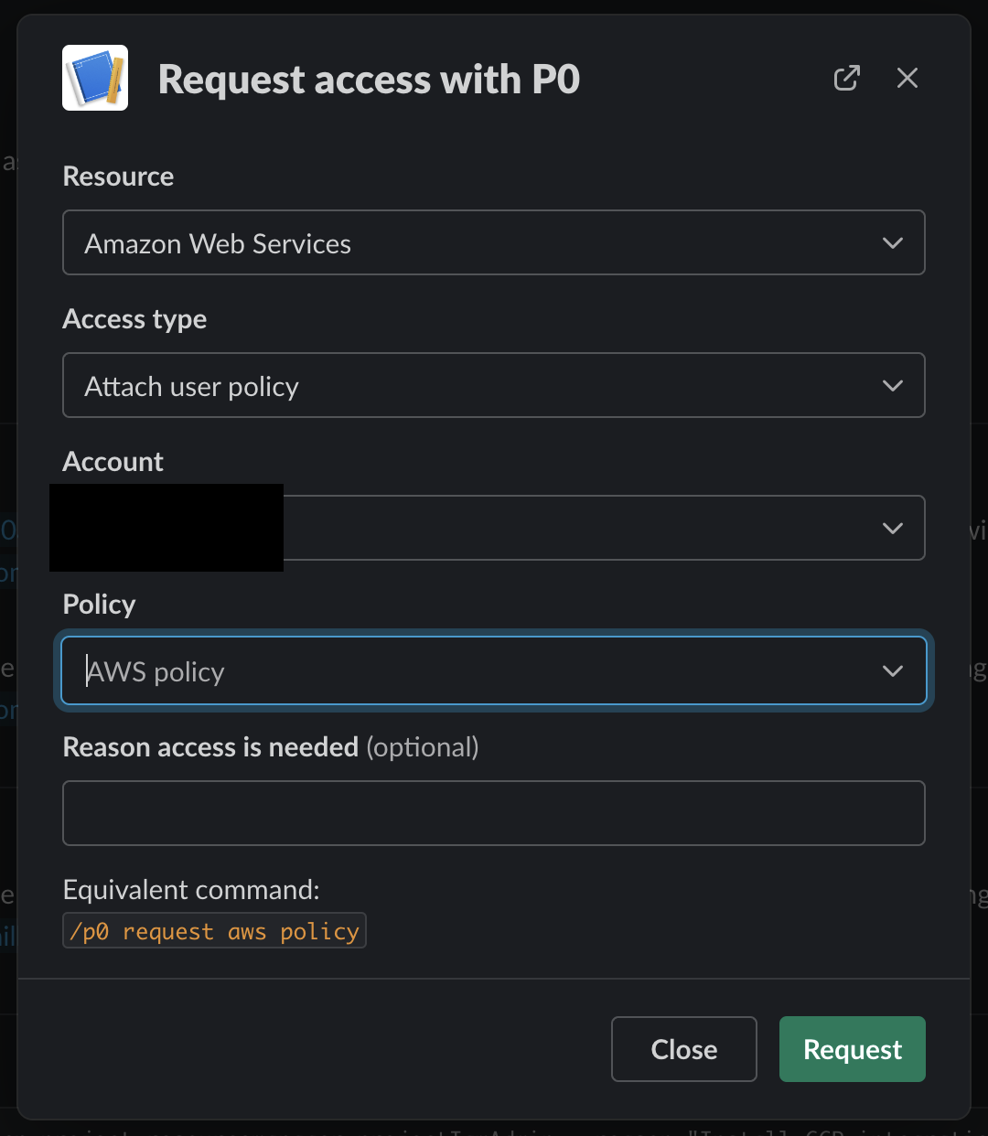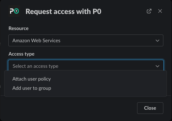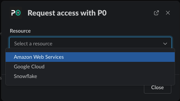 Open up the p0 modal using `/p0 request` in Slack or with [the Request Access feature ](https://docs.p0.dev/user-guides/getting-started-with-just-in-time-access#via-the-p0.app)in p0.app and select "Amazon Web Services" as the resource.