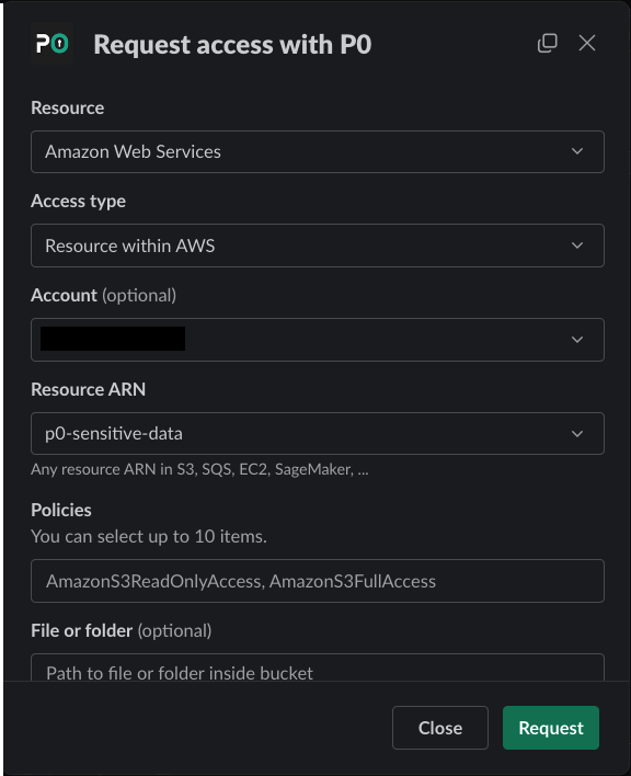 For example, request access to a specific S3 bucket called `p0-sensitive-data`: