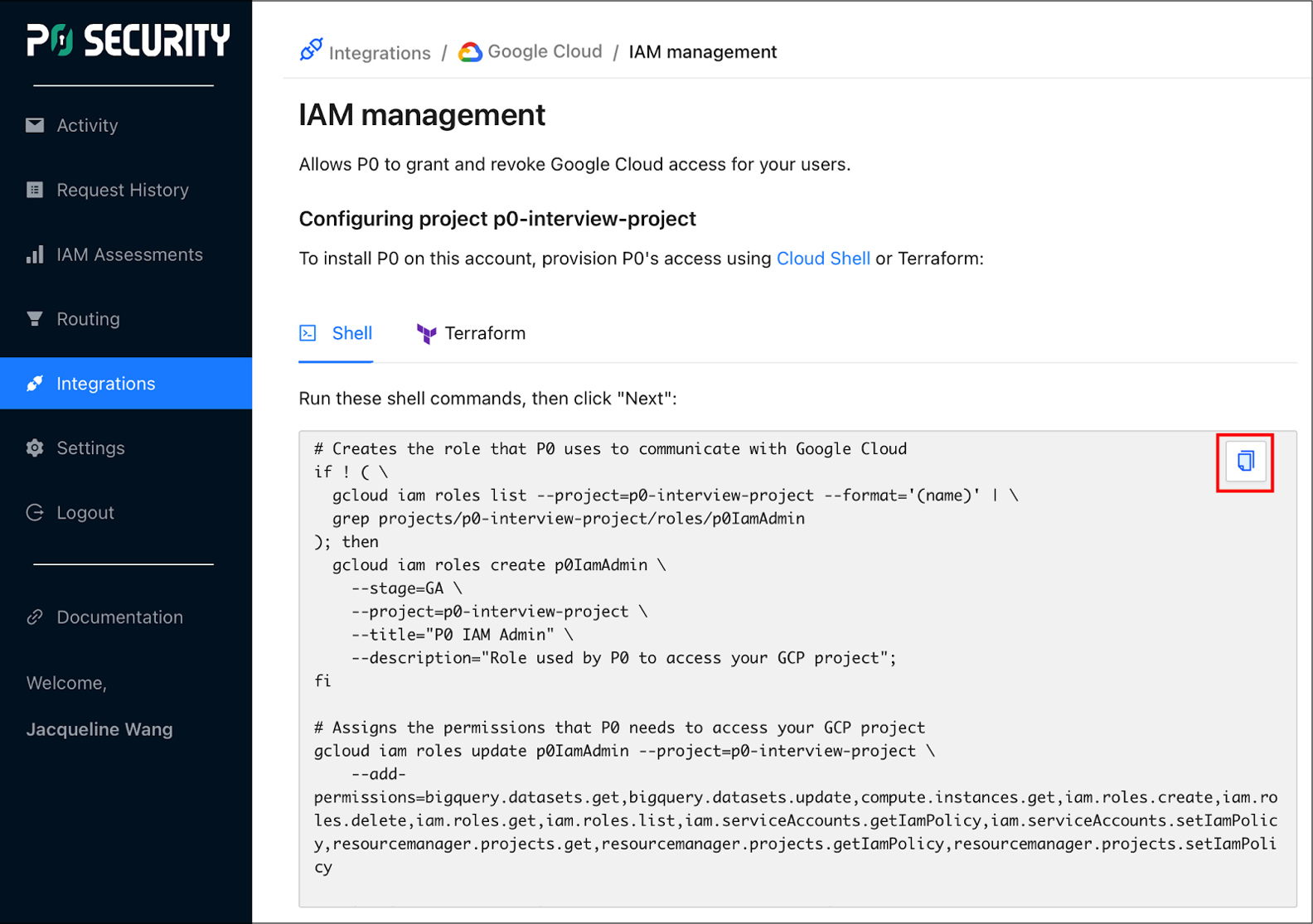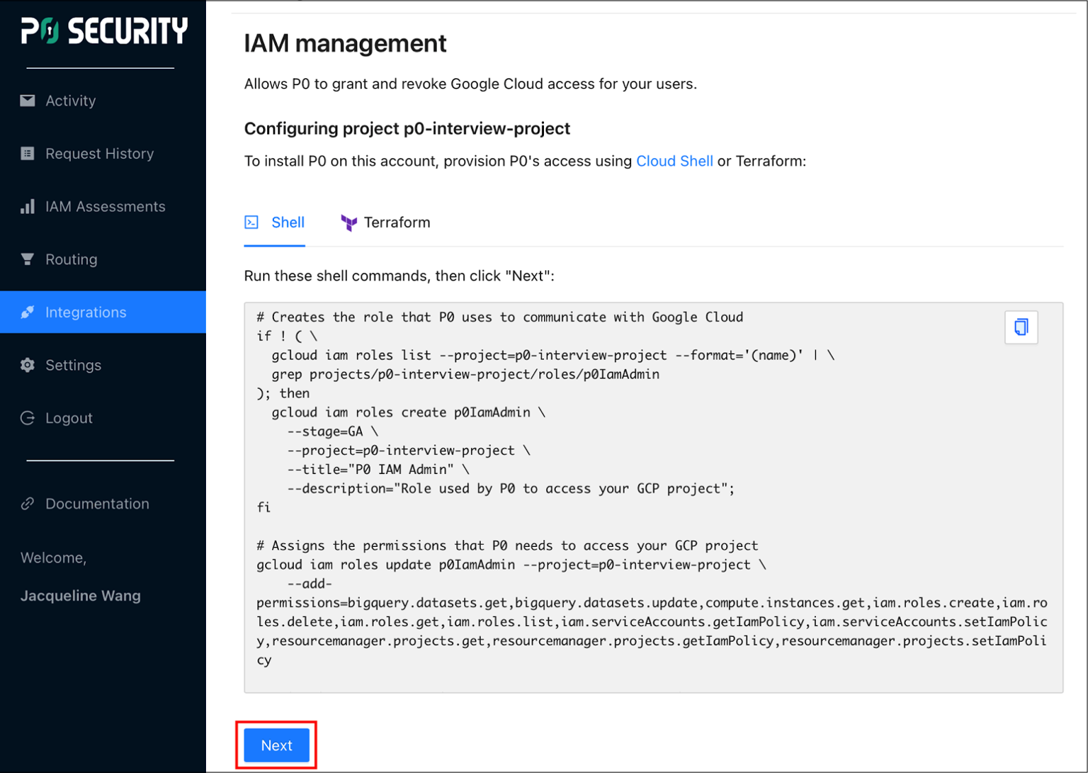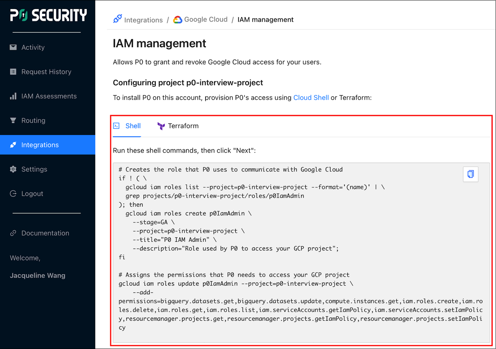 You can provision P0 IAM management Access using [Google Cloud Console Shell](https://console.cloud.google.com) or Terraform. For this example, we’ll use the GCP console shell.