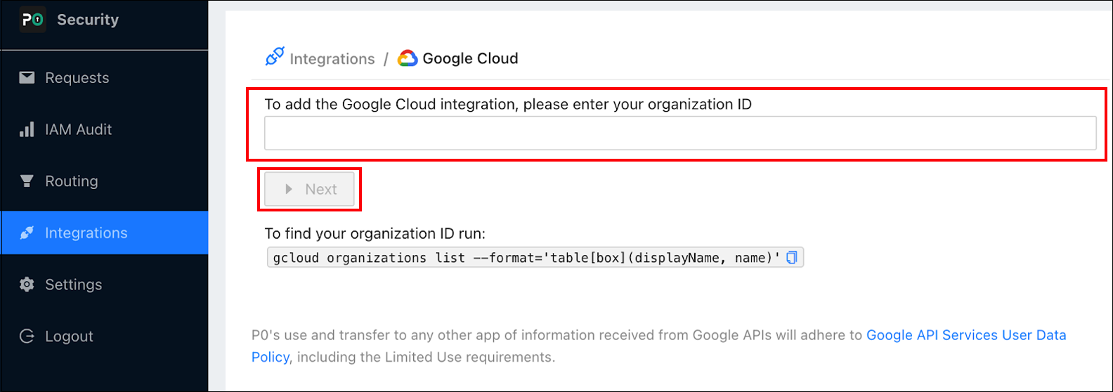 If a previous Google Cloud integration is present, the field is disabled and pre-populated with the organization ID, so proceed to the next step.