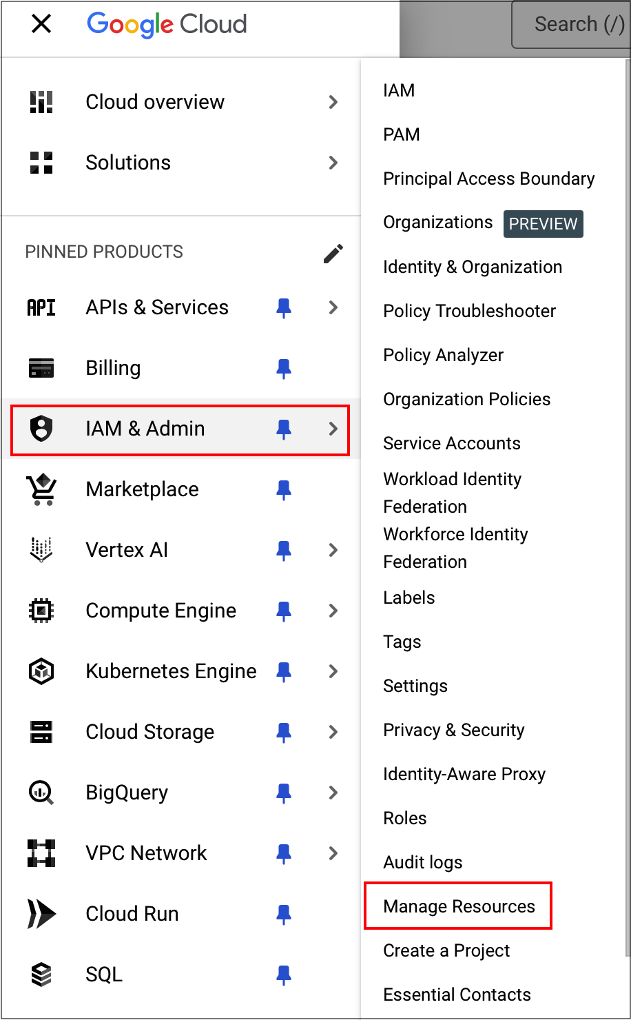* Go to **IAM & Admin** > **Manage Resources**. You will find your organization ID listed under the ID field.