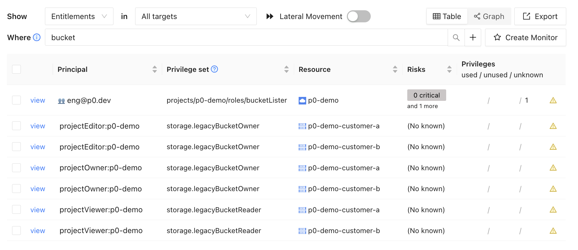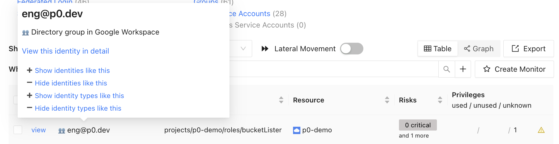 The inventory page lets you browse and query your entire IAM configuration, combining data from your identity provider, IAM policies, your access logs, and P0's [IAM Privilege Catalog](https://catalog.p0.dev).