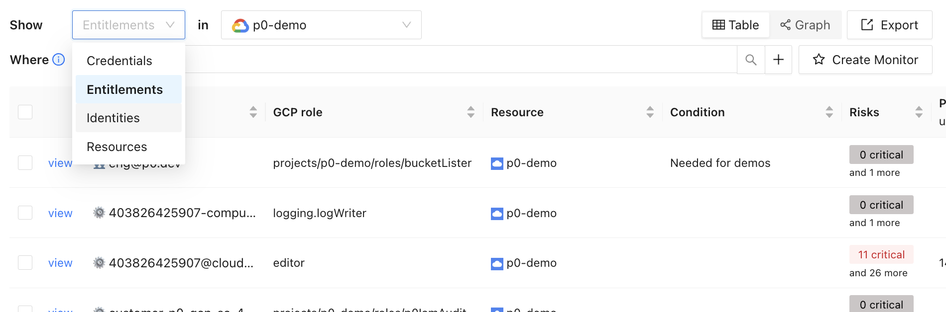 You can display credentials, entitlements, identities, or resources by selecting these in the "show" selection: