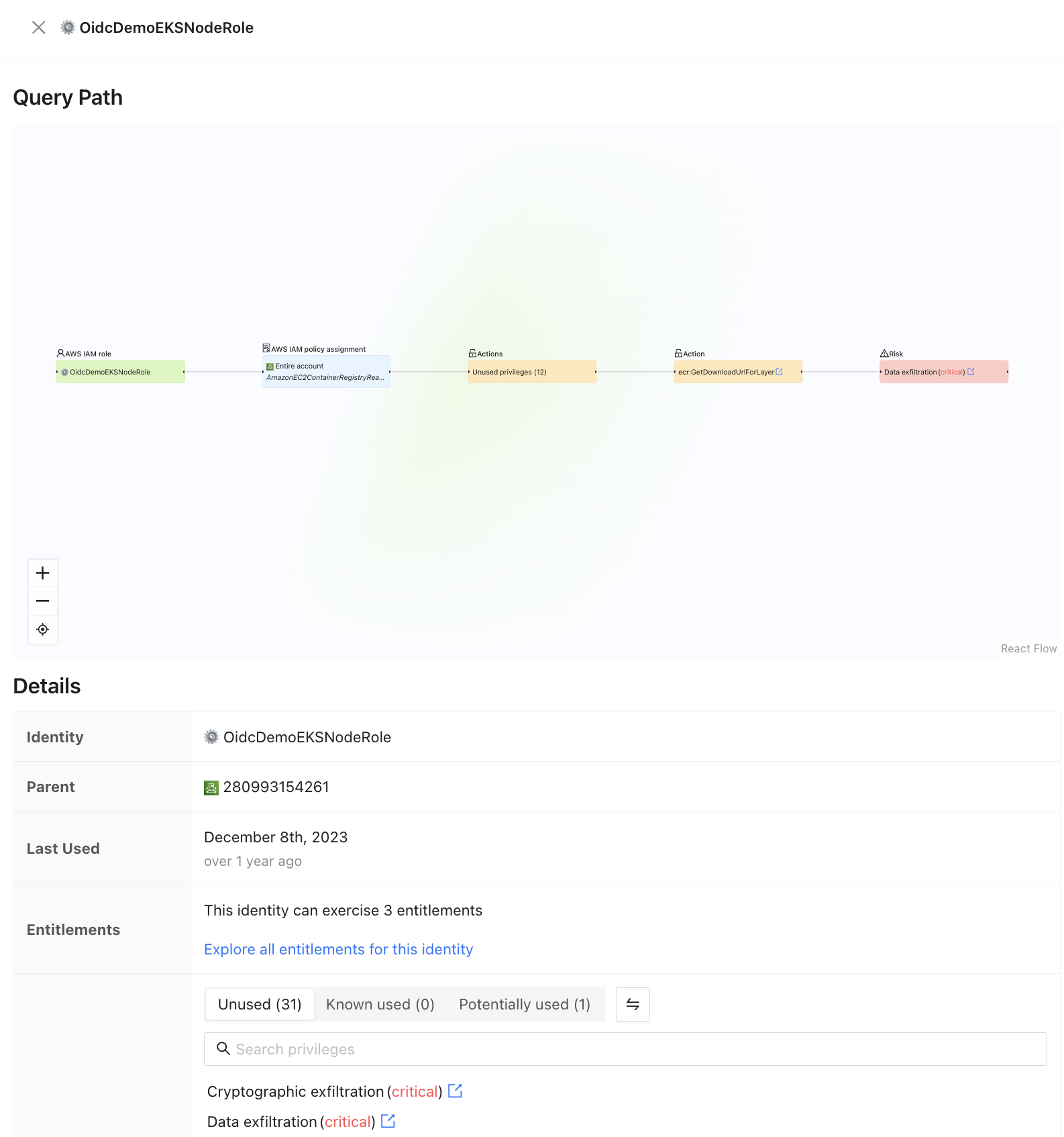 At the top of the details you'll see a graph visualization of why this result matches your query. For instance, if you select an identity with `risk:exfiltration` as your search, you'll see the entitlements and privileges that lead to data-exfiltration risks.