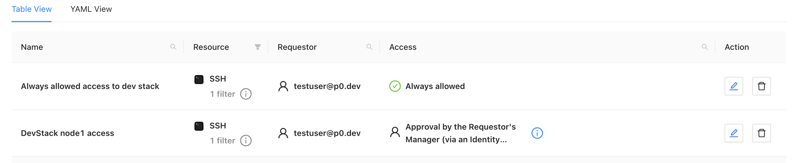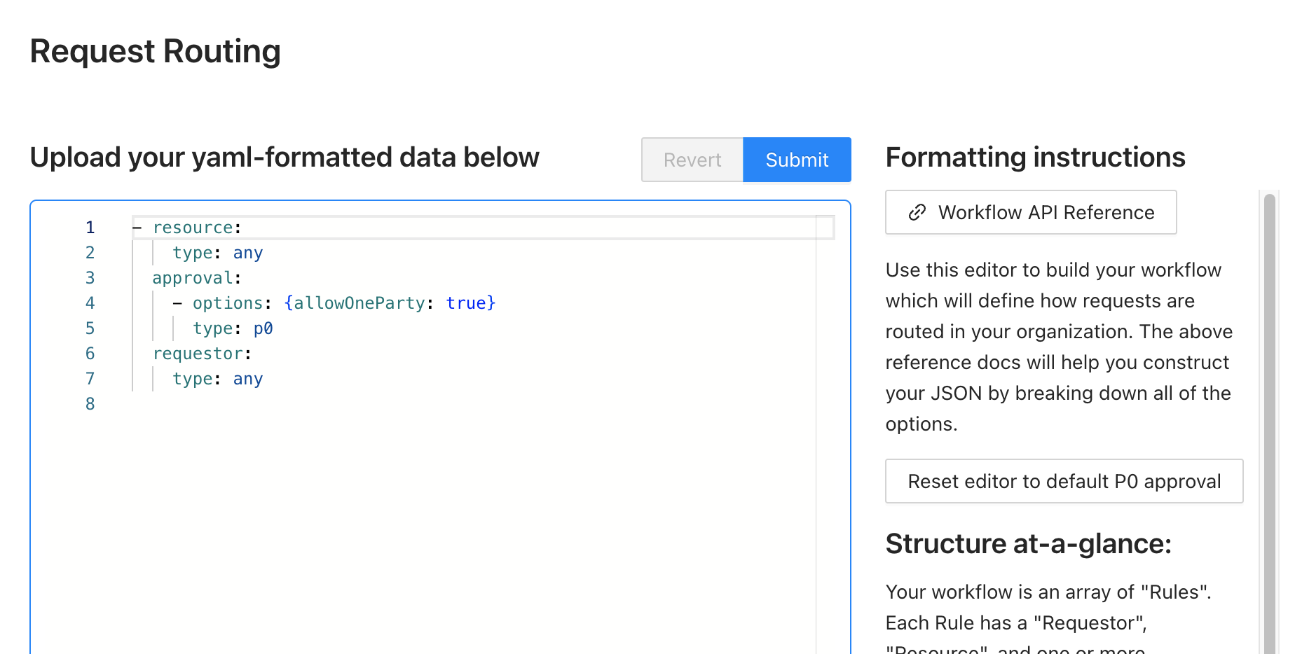 We call a collection of routing rules a Workflow, and when you want to make changes to the way your requests are routed in p0 (such as, sending engineers' request to their managers, or restricting access to a particular prod resource to a small group), you do so by submitting a new Workflow.