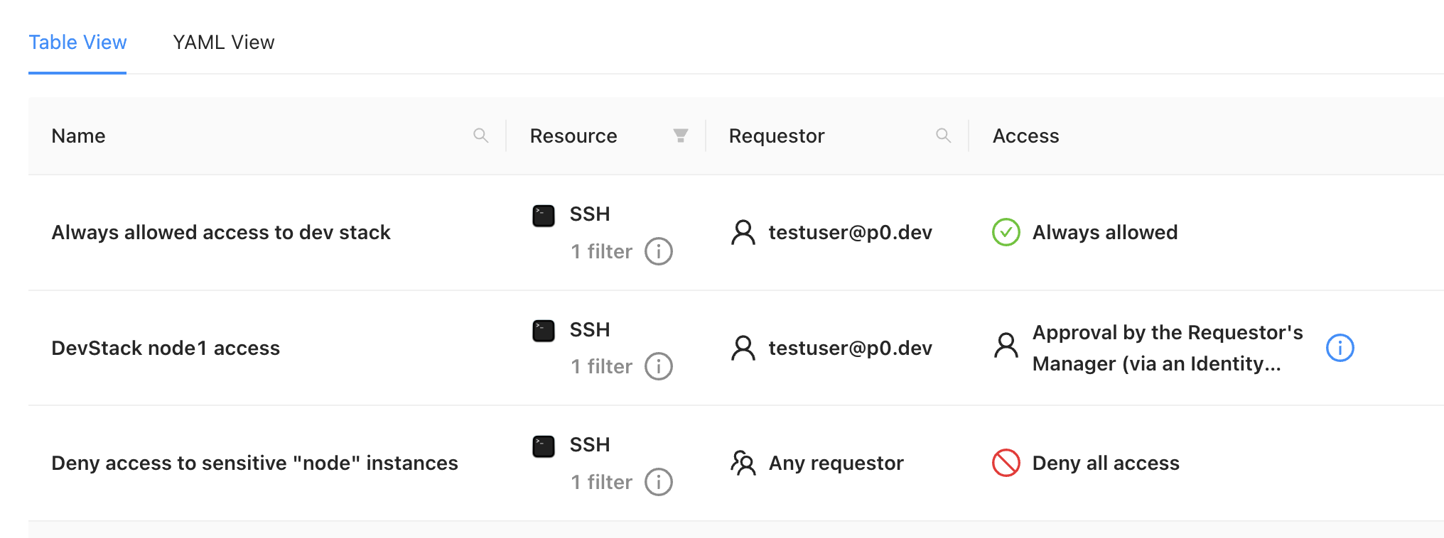For more detailed information on the filters, see the documentation for [AWS](https://docs.p0.dev/orchestration/just-in-time-access/request-routing/aws-filtering), [Microsoft Azure](https://docs.p0.dev/orchestration/just-in-time-access/request-routing/microsoft-azure-filtering), [Google Cloud](https://docs.p0.dev/orchestration/just-in-time-access/request-routing/google-cloud-filtering), and [SSH](https://docs.p0.dev/orchestration/just-in-time-access/request-routing/ssh-filtering).