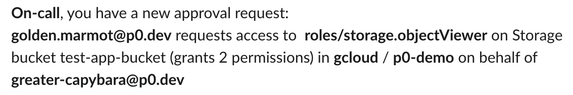 To make a 2nd-party access request, use the /p0 grant slash command in Slack.