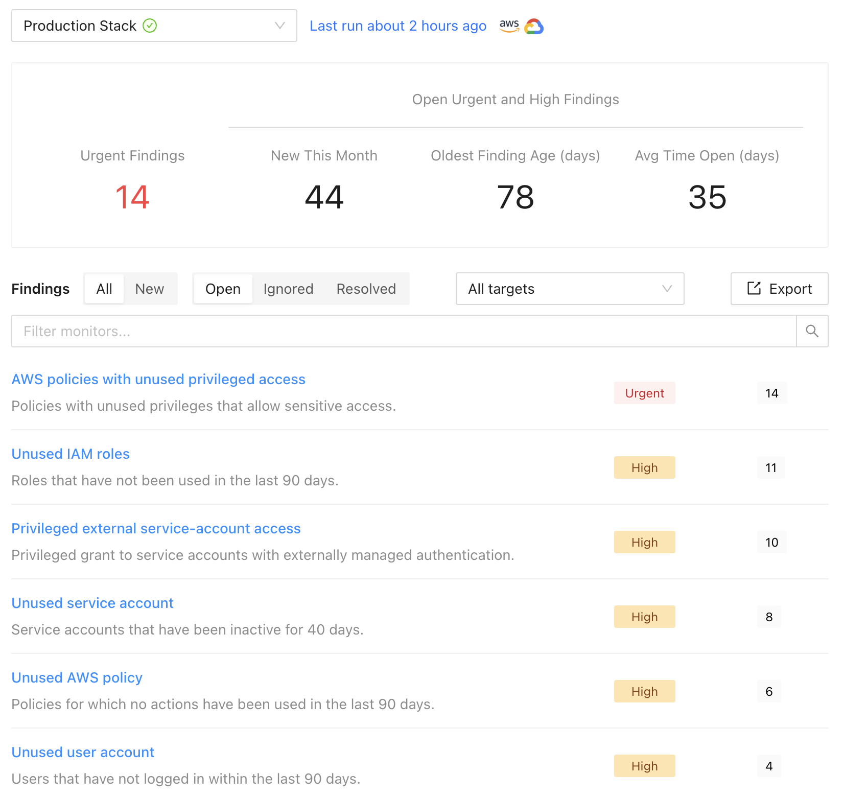 You can narrow results to a specific target scope (e.g. AWS account, Azure subscription, or GCP project) or monitor.