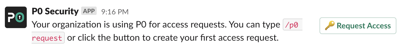 Type `/p0 share` in any channel or DM, and the P0 bot will respond with a message that explains how to use P0 for access requests and includes a button to immediately begin an access request.